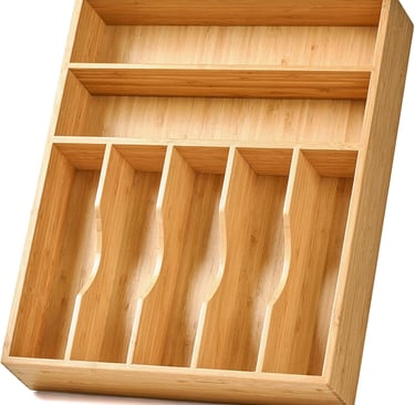 The solid bamboo construction and deep slots keep flatware neatly separated and prevent utensils from sliding around.