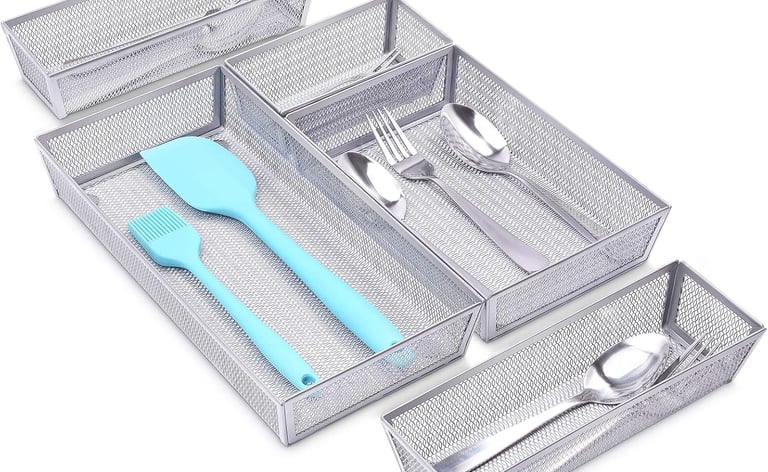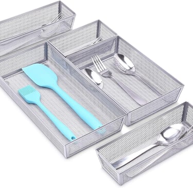 Location: Fits shallow kitchen drawers, desks or office drawers | Capacity: Five separate compartments | Material: Rust‑resistant metal mesh with foam feet | Dimensions: Largest compartment ~12.1 × 5.9 inches; overall height ~2 inches