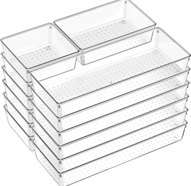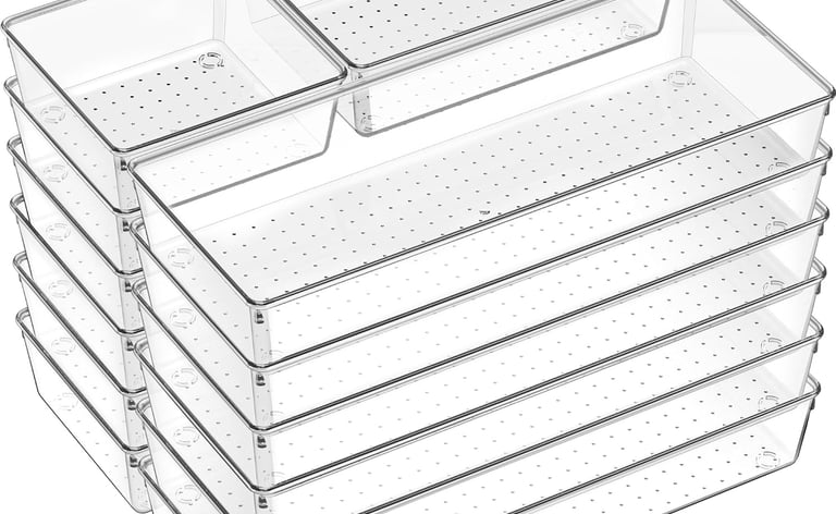 For homeowners who need more than a single tray, the Criusia 18‑Piece Clear Drawer Organizer Set delivers incredible versatility. Each set includes six 6 × 6 × 2‑inch bins, six 6 × 9 × 2‑inch bins and six 6 × 15 × 2‑inch bins. Made from BPA‑free PET plastic, these durable containers are stackable and come with non‑slip silicone pads to keep them in place. Their transparent walls let you see contents instantly, making them perfect for storing silverware, spices, makeup or tools. Because they can be configured horizontally or vertically, they suit deep kitchen drawers just as well as dresser drawers or bathroom vanities. If your storage needs change over time, simply rearrange or stack the bins to suit your new setup.