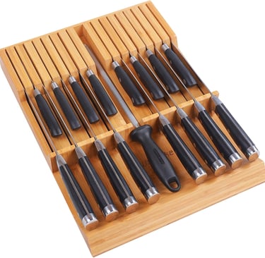 Location: Fits kitchen drawers with inner dimensions >17.1 × 12.7 inches | Capacity: Slots for 16 knives plus a sharpening steel | Material: Bamboo | Dimensions: 16.6 × 12.2 × 1.8 inches