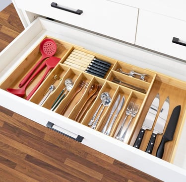 To find the best kitchen drawer organizers, we evaluated several criteria common to quality storage solutions. The first consideration was materials. Bamboo and solid wood trays tend to be durable and sustainable, whereas plastic options are lighter and easier to clean. We also looked at capacity and configuration, noting how many slots or bins each organizer offered and whether those spaces could accommodate both standard silverware and larger utensils. A good organizer should keep items separated and easy to see without wasting space—an approach emphasized by home organization resources that recommend clear compartments and dividers to maximize drawer efficiency.