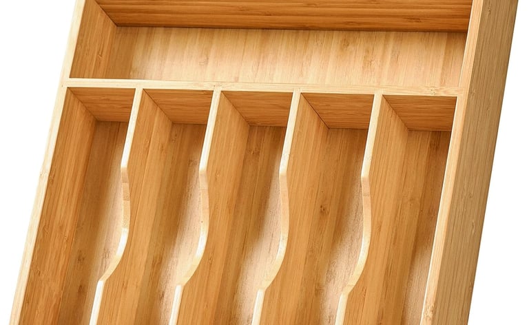 Location: Fits drawers at least 18 × 21.6 inches | Capacity: 10–12 compartments plus removable block for six knives | Material: Bamboo | Dimensions: 16.93 × 35.04 × 2.48 inches (expandable)
