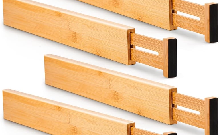 Location: Fits drawers with inner dimensions 17.8–20.6 inches long | Capacity: Four adjustable dividers create customizable compartments | Material: Bamboo with non‑slip pads | Dimensions: Dividers extend from 16.6 to 21.7 inches long and 2.4 inches high