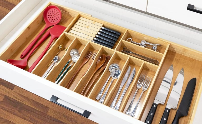 Measure your drawers carefully, considering length, width and depth. Some organizers are designed for shallow drawers while others need deeper space to accommodate tall utensils. Expandable or adjustable options work well in rental kitchens or older homes where drawer sizes vary. Keep in mind that an organizer should fill your drawer without forcing you to wedge it in.