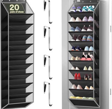 Most over‑door organizers come with thin metal hooks that fit standard interior doors and distribute weight evenly. To avoid scratches, place felt pads under the hooks and ensure the door still closes properly. The Kotkn Hanging Storage Rack holds up to 30 pairs yet remains lightweight thanks to its breathable fabric, making it gentle on doors.