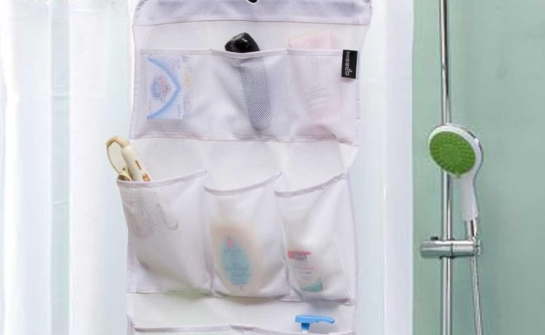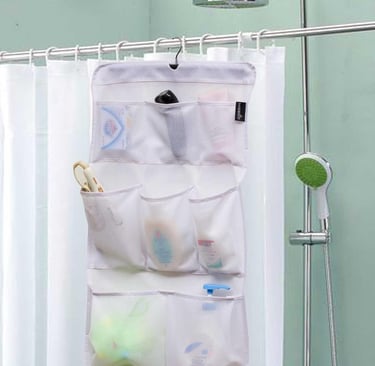 The rotatable metal hanger lets you suspend the caddy from a curtain rod or under the shower head, and the quick‑dry mesh prevents mildew.
