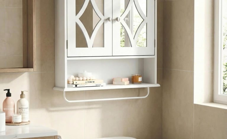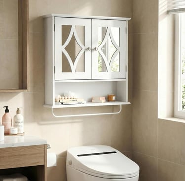Bathroom walls are often underutilized, especially the space above the toilet. RoyalCraft’s wall cabinet turns that area into useful storage without sacrificing aesthetics. It includes two mirrored doors with adjustable shelves inside for toiletries or medicines, plus an open towel rack underneath for easy access. The cabinet is constructed from engineered wood that meets TSCA and EPA standards and coated with low‑VOC paint. At roughly 22 inches wide, it fits comfortably between most light fixtures and toilets and doesn’t protrude excessively. The diamond pattern on the doors adds visual interest, making it feel like décor rather than a purely utilitarian fixture. For renters, it’s a convenient way to add storage in a small bathroom without crowding the floor with more furniture.