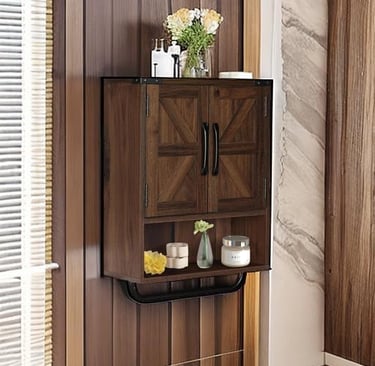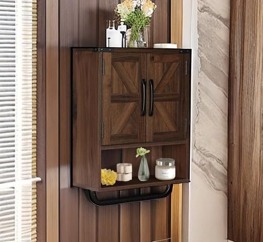 For those who want their storage solution to make a design statement, the RUSTOWN Farmhouse Cabinet delivers. This wall‑mounted unit borrows its style from reclaimed barn doors, sliding along metal rails to reveal or conceal interior shelves. The adjustable shelf inside accommodates tall bottles or stacks of towels, while an open bottom shelf and a removable towel bar provide extra functionality. Its combination of wood grain and metal hardware feels warm yet sturdy. Though sold for bathrooms, this piece works equally well in a kitchen for spices and mugs or in a mudroom for hats and mail. If you prefer closed storage over fabric pockets, its concealed shelving hides clutter behind a stylish façade. Just mount it securely into studs or use appropriate anchors; filled with candles, vases or jars, it’s a showpiece and storage solution in one.