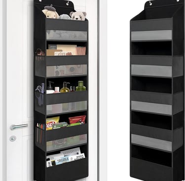 If you’re working with limited square footage, this over‑the‑door organizer from Simple Houseware offers smart vertical storage without cluttering your floor. The six extra‑large pockets are each 6 inches tall, with 8.5 inches of space between pocket bottoms, providing room for bottles, rolled towels or cleaning sprays. Transparent panels let you see contents at a glance, saving time when you’re searching for toiletries or baby supplies. Metal hooks slip over standard doors; no tools are required, making it perfect for renters or dorm dwellers. At just 13 inches wide and 4.5 inches deep, it fits even narrow doors.