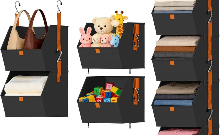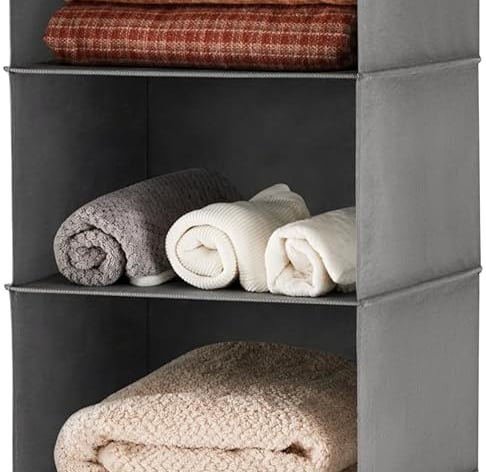For shoppers looking to organize a closet on a tight budget, the MAX Houser 6‑Tier Hanging Shelf is hard to beat. It hangs from any closet rod via two sturdy hooks and unfolds into six compartments measuring 12 × 11.5 × 42 inches overall. Lightweight yet durable non‑woven fabric holds sweaters, hats and shoes without sagging. The open design maximizes visibility and makes it easy to retrieve folded clothes or accessories, an approach professional organizers recommend for accessibility. When not in use, the organizer folds flat for storage or travel.