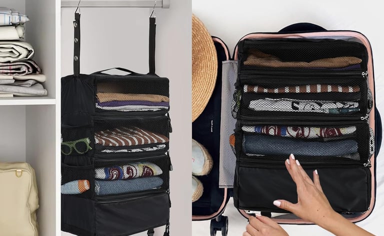 Location: Suitcase/hotel closet | Capacity: 4 main compartments + side pockets | Material: Polyester | Dimensions: 14.5 × 7 × 22.5 inches