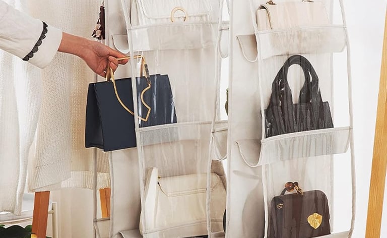 Eight transparent pockets offer 360‑degree visibility for purses or linens