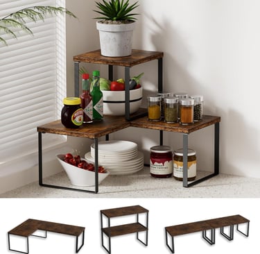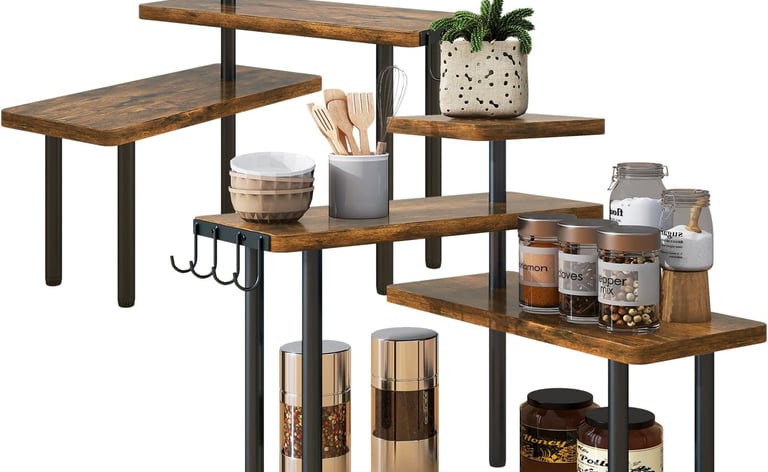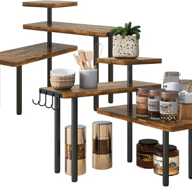 The IBUYKE countertop organizers come as a pair of three‑tier shelves that can be configured in various ways. Each unit measures 24.8 inches long and features adjustable shelves, allowing you to change the orientation to suit your space—straight, angled or L‑shaped. The retro particle‑board surfaces pair with a black metal frame for a farmhouse‑industrial look. Each shelf holds up to 22 lb, making this set suitable for heavier spices, dishware or books. Included side hooks provide extra storage for utensils or small towels. While they take longer to assemble than single‑tier models, the result is an attractive and highly functional storage system.