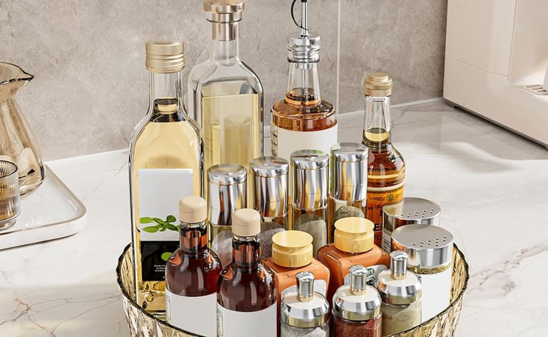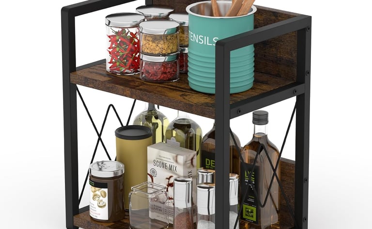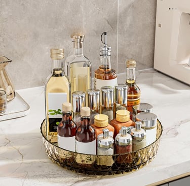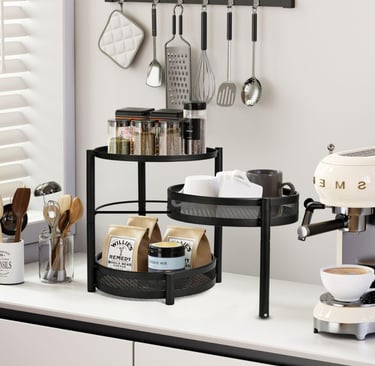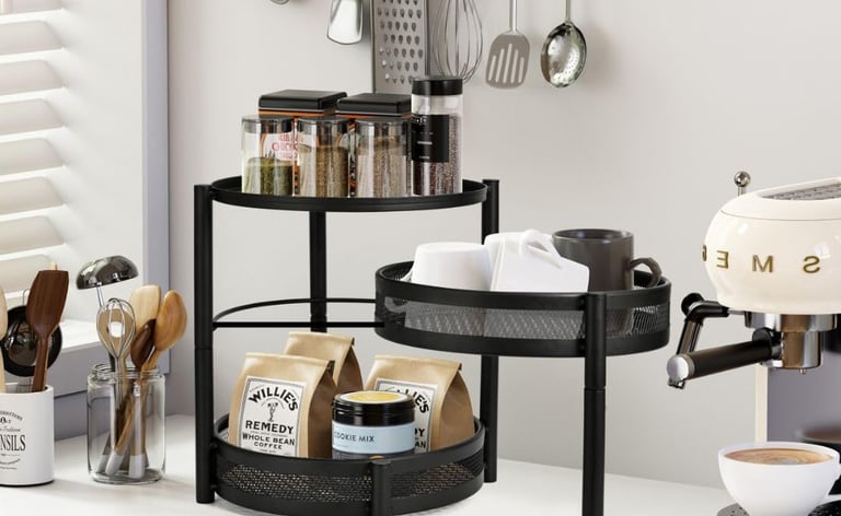 Measure your countertop, cabinet or corner before purchasing. Products in this guide range from just under 8 inches wide for the rotating spice rack to over 33 inches long for the over‑the‑stove shelf. If your countertop is narrow or you plan to tuck the organizer into a corner, choose a compact design like the Aduangbang Accessories Organizer or a rotating spice rack. For unused wall or appliance space, the over‑the‑stove shelf provides a clever storage spot without taking up counter space. Make sure you leave room for taller items—some shelves like the IBERG 3-Tier Organizer have a higher clearance between tiers to accommodate bottles or cups.