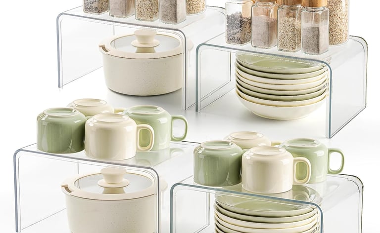 This set of four clear PET shelves elevates organization with a modular twist. Each shelf can be used independently or stacked to create two‑ or three‑level risers. The clear plastic construction blends seamlessly with any decor and lets you see everything at a glance. With load capacities up to 33 lb per shelf, they can hold spices, condiments, cosmetics or even small pots. If you have a deep cabinet or pantry, you can place shelves side by side or in an L‑shape to maximize space. Non‑slip stickers are included to keep the shelves securely in place.