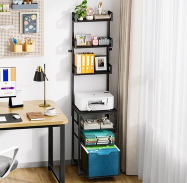 Look for a tall, narrow file cabinet or a rolling cart with a small footprint. Units that stand under 12 inches wide but rise to 5 feet provide plenty of drawers and shelves without encroaching on limited floor space.