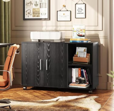 This versatile cabinet is a vertical file organizer that adapts to almost any room. The dual doors conceal adjustable shelves for storing books, paper reams, kitchen gadgets or office supplies, while the broad top serves as a printer stand or display area. Crafted from FSC‑certified wood, it holds up to 150 pounds and rolls effortlessly on five swivel wheels. The understated wood grain finish blends into a living room, bedroom or home office without looking utilitarian.