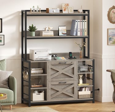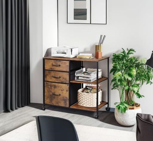 This stylish lateral cabinet proves that file storage doesn’t have to look utilitarian. The three fabric drawers slide out smoothly on wooden runners and can hold pencils, folders and office odds‑and‑ends. Above them, two open shelves and a broad top surface accommodate a printer, scanner or decorative items. The rustic brown wood grain print pairs beautifully with farmhouse, industrial or mid‑century décor, while four casters (two locking) make moving the cabinet effortless. It weighs only 22 pounds, so it’s easy to assemble and reposition as your space evolves.