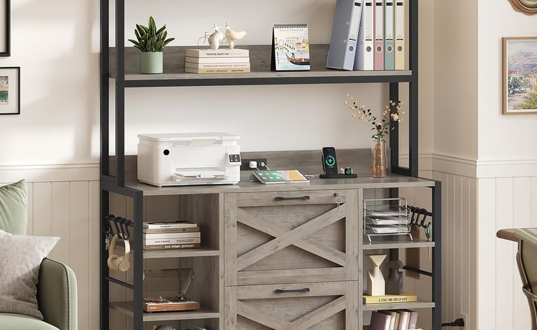 For those who want their vertical file organizer to do double duty, this cabinet includes built‑in power: two outlets and two USB ports to charge a printer, laptop, lamp and phone simultaneously. The expansive top (nearly 38 inches wide) holds a printer and scanner side by side, and six open shelves keep binders, notebooks or reference books neat and accessible. Two deep drawers come with adjustable hanging rails to fit legal, letter or A4 folders, and a lock protects sensitive documents. Eight hooks along the side hold bags or headphones, and an anti‑tip bracket keeps everything anchored.