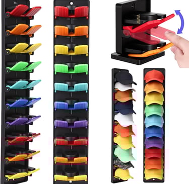 Each rack holds up to 10 caps using spring‑loaded clips that secure hats without damaging their brims; dual mounting options include tool‑free adhesive strips or screws for drywall, wood, or tile. Durable ABS construction resists moisture and deformation, making the racks suitable for closets, entryways, or laundry rooms.