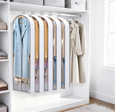 Location: Closet, Wardrobe, Travel | Capacity: 5 garment bags (each fits 4 coats or 10 dresses) | Material: Breathable fabric with clear panel | Dimensions: 24 × 4 × 60 in | Special Features: Gusseted design, full‑length zipper, dust protection