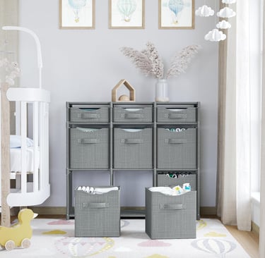 Location: Bedroom, Nursery, Living Room | Capacity: 9 cubes with bins | Material: Iron frame with fabric bins | Dimensions: 36 × 12 × 31 in | Special Features: Tool‑free assembly, included storage bins, modular design