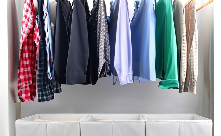 Seasonal garments store well in the top of closets or under beds using breathable garment bags or stackable bins that protect against dust and humidity.