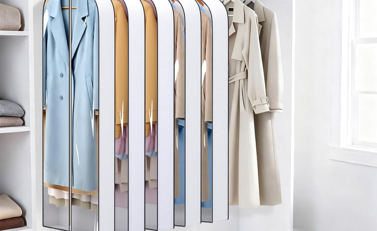 Each gusseted garment bag holds up to four coats or 10 dresses, providing generous capacity for protecting formal wear from dust and light exposure. The breathable material and clear viewing panel make it easy to identify garments without opening the bag, and the top opening accommodates hanger hooks while keeping the bag fully closed.