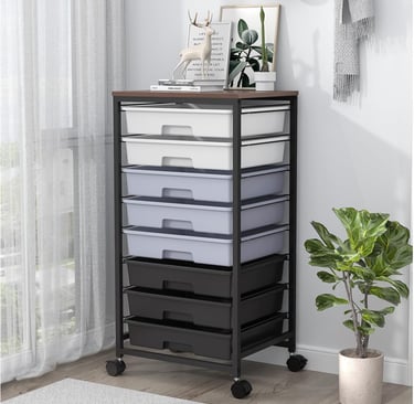 Offers eight spacious drawers plus a sturdy wooden top, giving you both enclosed storage and a workspace. Smooth‑rolling wheels with brakes make it easy to reposition.
