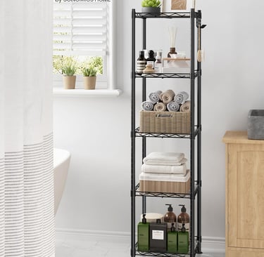 Bathrooms and laundry rooms are notorious for lacking storage. SONGMICS solves this by going vertical. Each tier can hold around 44 lbs., and you can adjust the shelf height or even split the unit into two shorter racks. The extendable design allows you to connect multiple units to create one tall tower—a clever trick for renters who need non‑permanent solutions. We also like the inclusion of five polypropylene (PP) shelf liners and a removable 4‑in‑1 hook. The powder‑coated metal resists rust, so you can place it near the shower or washing machine without worrying about moisture. For anyone dealing with narrow bathrooms, this shelf delivers a lot of storage in a small footprint.