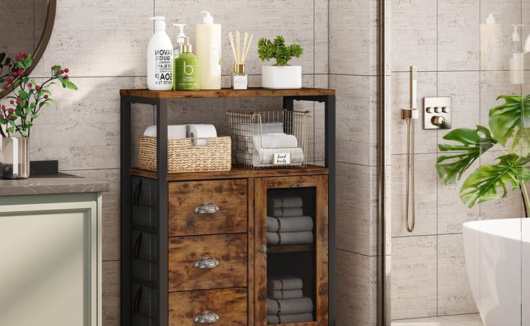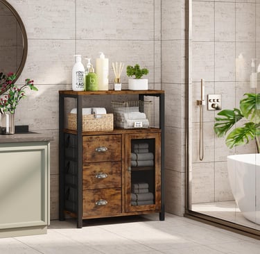 If you need a piece that does more than hold towels, the Homeiju cabinet is a versatile pick. Crafted from engineered wood and metal, it features three deep drawers on one side and a cabinet with a see‑through mesh door on the other. The mesh door lets you see decorative baskets or linens while keeping dust at bay. Industrial handles and adjustable feet lend a farmhouse‑chic aesthetic. With dimensions of 22.44″ D × 11.81″ W × 33.18″ H, the cabinet doesn’t overwhelm small bathrooms, yet it still provides ample storage. Use the drawers for toiletries, cleaning supplies or toys, and the cabinet for towels or cookbooks in kitchens. It’s a great way to add character while keeping clutter contained.