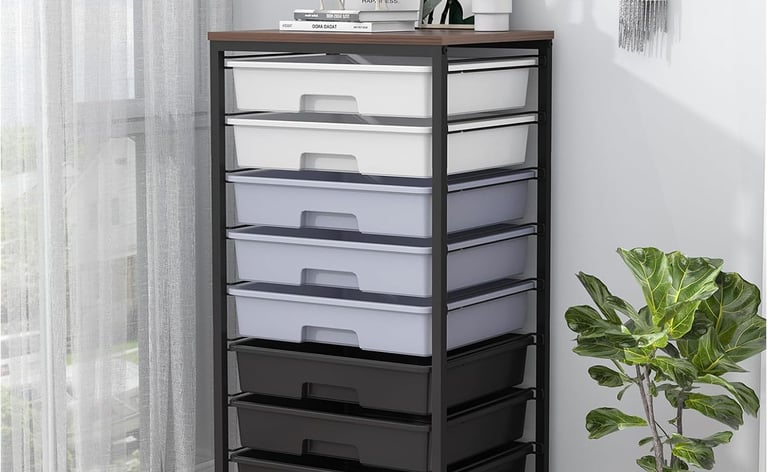 For paperwork and office supplies, the SYKIARIOL Rolling Utility Drawer Cart provides both surface space and hidden compartments. Modular trays work well for organizing desk drawers. If you’re short on floor space, wall‑mounted shelves can keep printers or books off your desk.
