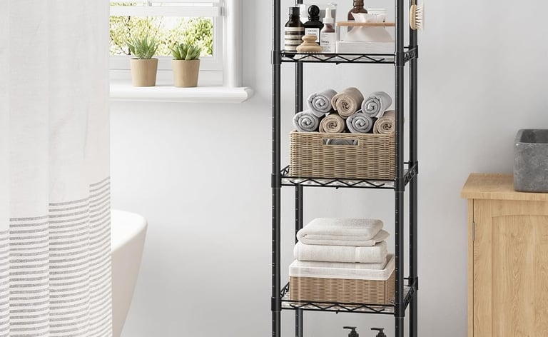 Freestanding vertical shelves or slim carts are ideal. Look for adjustable tiers so you can fit tall shampoo bottles. Storage cabinets with mesh doors keep towels dust‑free while adding visual interest. Non‑slip pads or adjustable feet keep units steady on tile floors.