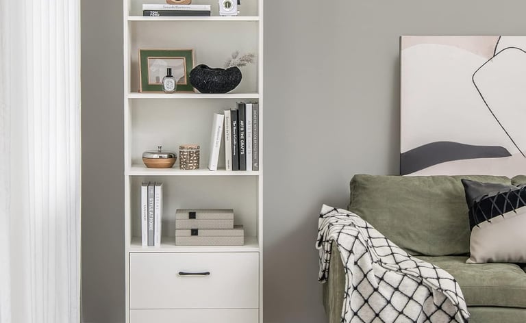 Premium organization pieces should be both functional and stylish. CHEFJOY’s 4‑tier bookcase has a slim 13.5″ depth and stands over 6 feet tall, yet it’s sturdy enough to hold up to 220 lbs. thanks to its thick engineered‑wood shelves and metal hardware. Two large drawers glide smoothly on metal tracks, providing hidden storage for small items like office supplies or accessories. Above them, four open shelves offer space for books, décor or baskets. An anti‑tipping kit ensures safety, which is especially important if you have children or pets. The modern white finish suits minimalist, Scandinavian and transitional interiors. Whether you place it in a living room, bedroom or home office, this piece acts as a functional focal point.