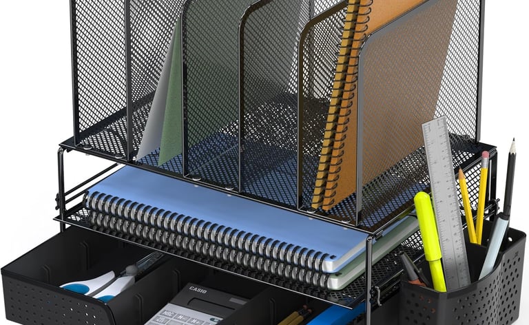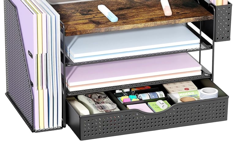 For small desks, the best organizers are usually the ones that reduce spread and keep essentials contained. Vertical storage can help keep papers, notebooks, or files accessible without taking over the main surface. Compact organizers that separate items into clear sections can also help prevent clutter from spreading across the workspace. The goal is to keep your primary work zone open while still having daily-use items within reach.