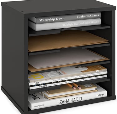 This adjustable paper sorter strikes an ideal balance between capacity, durability and aesthetic appeal. Made from solid engineered wood, the Ballucci organizer features five sturdy compartments that can be arranged horizontally for standard documents, vertically for magazines or upright as a tub file bin. The non‑slip felt feet keep it in place, and its classic black finish blends into any office décor. Because it’s stackable, you can purchase multiple units and expand upward as your filing needs grow. If you need a reliable vertical file organizer that can handle daily mail, bills, project folders and notebooks without looking out of place, this is the best overall choice.