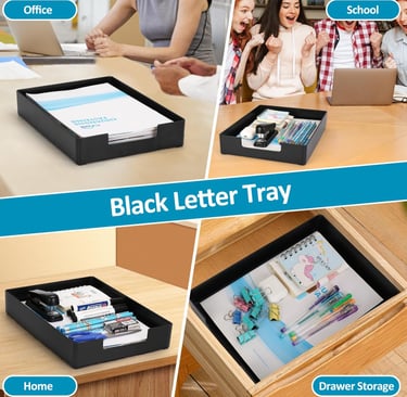 Location: Desk surface, bookshelf, drawer or countertop | Capacity: Fits standard A4 or letter‑size documents; stackable with other trays | Material: Thick ABS plastic with anti‑slip feet | Dimensions: 12.99 in L × 9.44 in W × 1.96 in H