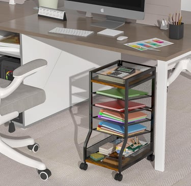 Location: Under or beside desks, narrow spaces | Capacity: Six tiers (four sliding mesh trays plus top and bottom boxes) | Material: Metal frame with wood accents | Dimensions: 14.96 in D × 11.02 in W × 24.6 in H