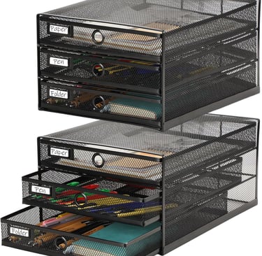 When you need serious storage capacity and premium features, this pair of three‑tier desk organizers fits the bill. Each unit is made from reinforced wire mesh and solid steel, giving it impressive durability. Pull‑out drawers protect documents and supplies from dust, while built‑in label slots allow you to categorize contents and quickly find what you need. Because the two units are stackable, you can create a towering vertical file organizer with up to six levels—perfect for keeping reports, forms and reference materials at the ready. The sleek black mesh looks professional and suits most office settings, and the generous weight capacity means you won’t have to worry about sagging shelves.