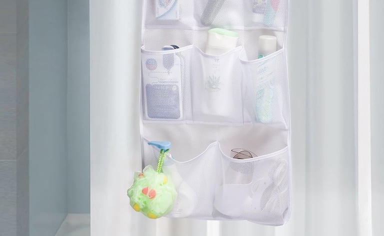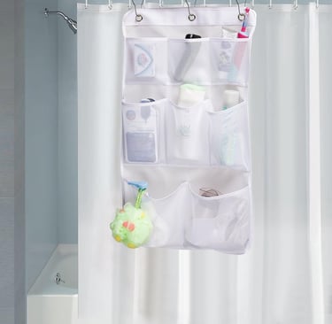 Location: Shower curtain rod, closet rod or RV hook | Capacity: Eight mesh pockets | Material: Quick‑dry mesh with metal rings | Dimensions: 16.5″W × 29.1″H