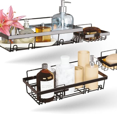 If you want a complete wall‑mounted bathroom organizer, this set from Bohemio Trends offers versatility. The two stainless‑steel racks provide ample room for shampoo, conditioner and body wash, while the two removable soap holders keep bars dry. Each shelf uses adhesive hooks, so there’s no need to drill. Once installed, the rustproof material stands up to moisture and the sleek silver finish complements most bathrooms. Because the set offers four separate compartments, you can customize the placement of each shelf to accommodate tall bottles or to keep certain items out of reach of children. It’s a solid pick for families or anyone needing a wall mounted bathroom organizer without committing to permanent hardware.