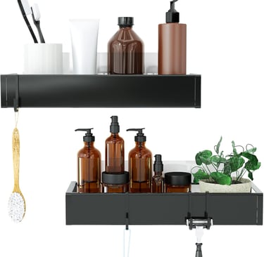 The Matte Black version of the KINCMAX Premium Shower Caddy ups the style factor while retaining the high‑quality materials that make the silver version our overall pick. Made from rustproof stainless steel and coated with a matte black finish, this two‑pack offers generous dimensions at 12.4 × 4.7 × 5.1 inches for one shelf and 12.6 × 5.5 × 5.1 inches for the other. Each shelf holds up to 20 pounds and features four movable hooks and a detachable soap holder. Installation is the same four‑step adhesive process: clean, peel, stick and hang. Because the weight capacity is high and the shelves are deeper than average, this premium option accommodates full‑size bottles, making it perfect for families or anyone with an extensive skincare routine. Its rustproof coating ensures longevity, and the matte black color complements modern bathroom décor.