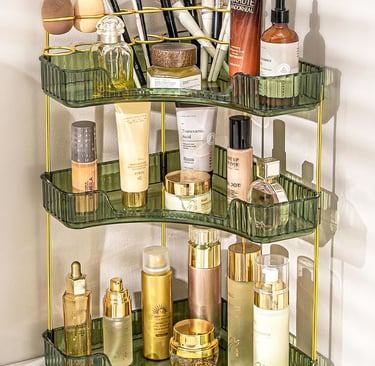 This green 3‑tier organizer maximizes corners on a vanity or bathroom counter, freeing up precious surface area. The countertop bathroom organizer tray holds skincare bottles on the lower levels while the integrated brush holder keeps brushes and sponges upright and clean. Golden rods and jewel‑toned trays elevate the look, turning everyday cosmetics into a display piece. Assembling the unit takes minutes, and its scratch‑proof acrylic construction resists moisture—ideal for steamy bathrooms. For anyone overwhelmed by bottles sprawled across the sink, this organizer brings order without sacrificing style.