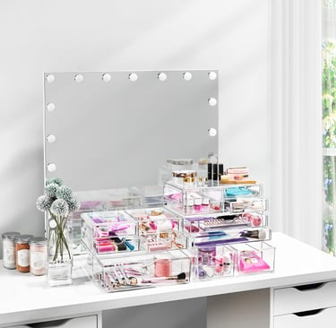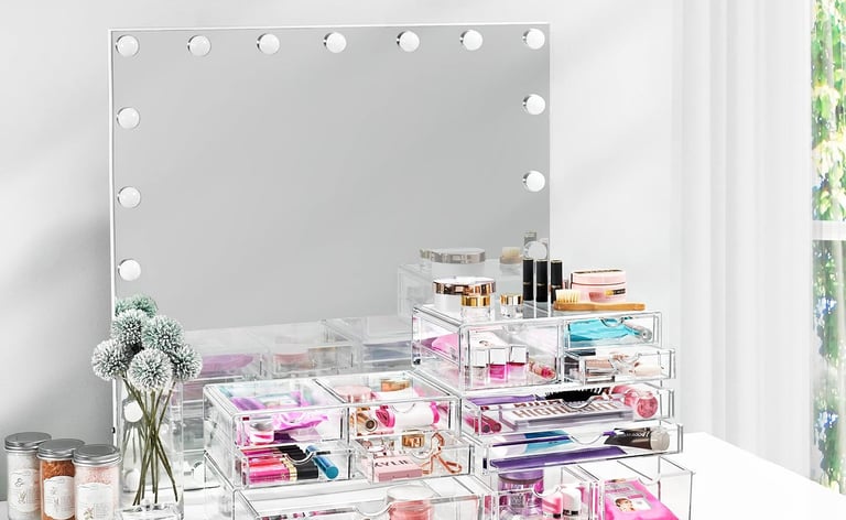 Two wide, clear drawers keep cosmetics dust‑free and easily visible.