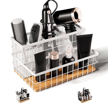 Location: Bathroom or bedroom vanity; also fits under sinks | Capacity: Four compartments (three square baskets plus base) for hot tools and brushes| Material: Powder‑coated iron with bamboo base | Dimensions: 11.81 × 7.28 × 6.14 in (L × W × H)