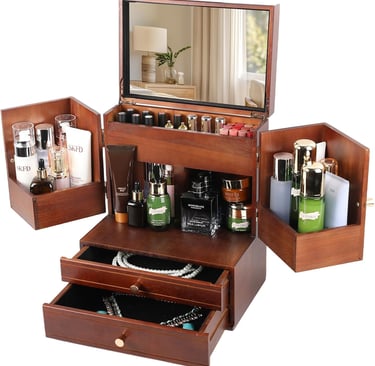 Those seeking a luxurious, all‑in‑one solution will appreciate this oak dresser‑top organizer. The fully enclosed design protects contents from dust and sunlight, prolonging the life of your cosmetics. Two flip‑down doors reveal roomy shelves for skincare bottles while a mirrored front doubles as a makeup mirror. Drawers and cubbies organize smaller items like lipsticks, jewelry or stationery. Because it arrives assembled, there’s no fiddling with screws—just unbox and start arranging. Premium materials and a timeless design ensure the organizer looks as handsome on a bedroom dresser as it does in a high‑end bathroom.