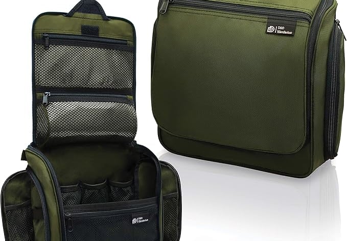 Ten compartments and a swivel hook keep toiletries organized and accessible on the road.