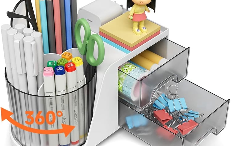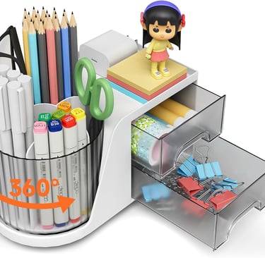 This budget‑friendly office supply organizer tray arrives fully assembled with a 360‑degree swivel so you can rotate to reach items at the back. It’s lightweight plastic and has two small drawers for paperclips or erasers plus open slots for pens and markers, keeping essentials accessible on cramped desks.