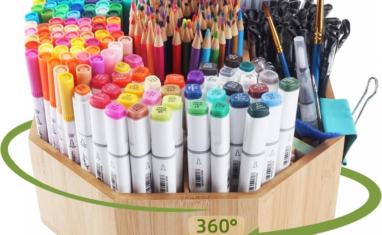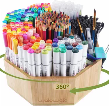 Extra‑large bamboo caddy holds over 800 pencils or 160 markers. A 360‑degree rotating base makes accessing brushes and markers effortless.