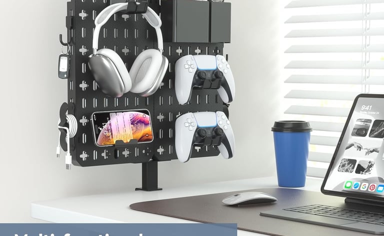 This clamp‑on pegboard is ideal for gamers who juggle controllers, headsets and cables, turning unused desk edges into organized storage. Its adjustable clamp requires no drilling and detachable pegboards let you move hooks and boxes where you want them, making it equally useful in studies or craft rooms.